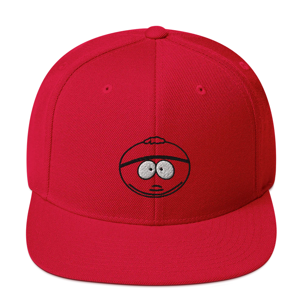 Whether you're out picking up Cheesy Poofs or in playing World of Warcraft with your friends, this South Park Cartman Embroidered Flat Bill Hat shows the world that you are the #1 Eric Cartman fan. Featuring Cartman's face embroidered against a red background, this flat bill hat is the perfect finishing touch to any style.